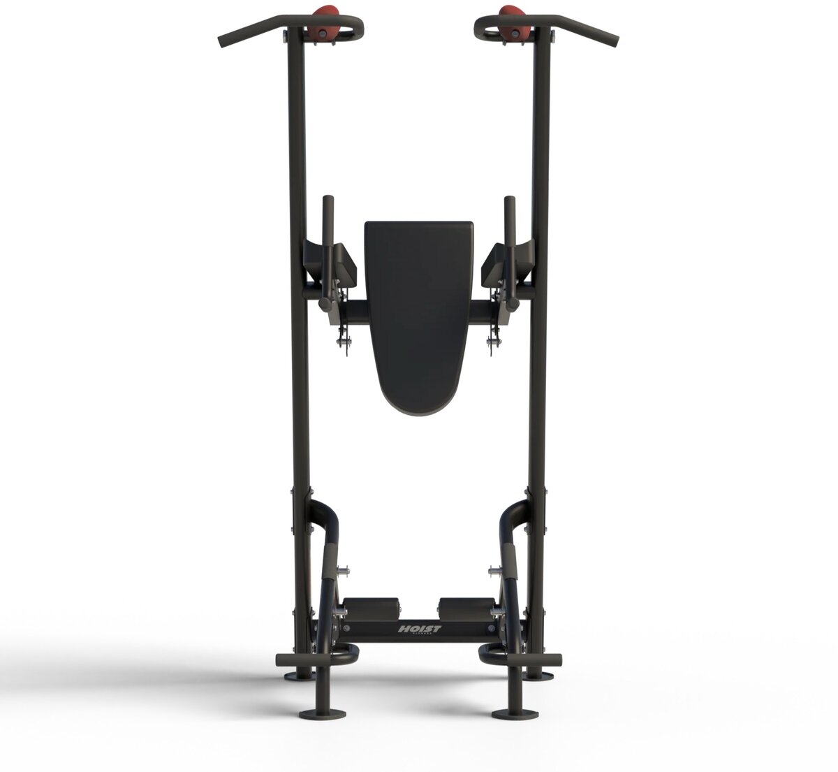 - Dual purpose back pad attaches for both vertical knee raise and sit up exercise positions